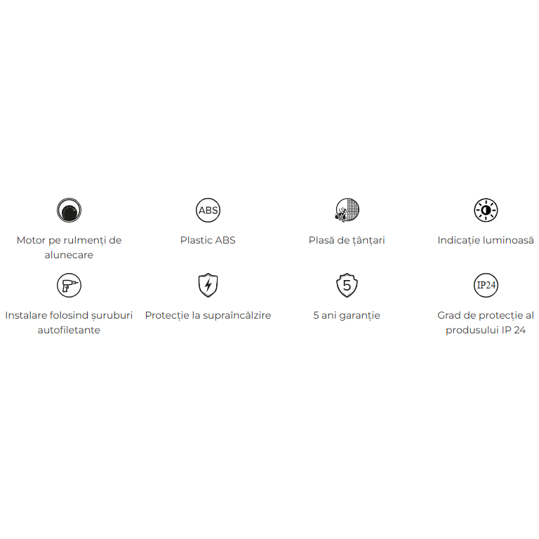 Carcasa ventilatorului este realizata din material plastic ABS sau PP de structura solida, durabil si rezistent la umiditate si coroziune.