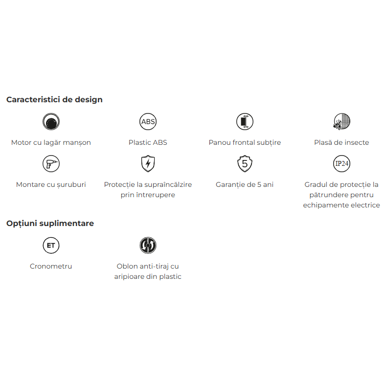 Functii ventilatie: Clapet anti-retur, Plasa impotriva insecte, Timer