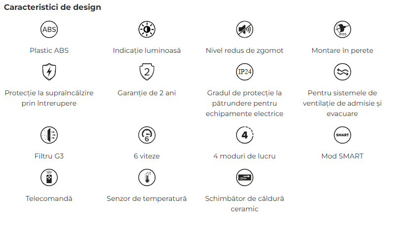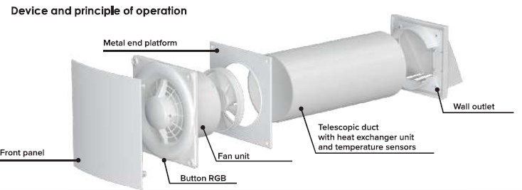 Dispozitivul furnizeaza aer proaspat la o temperatura confortabila in orice sezon. Recuperarea caldurii se realizeaza printr-un schimbator de caldura ceramic, care regleaza temperatura aerului introdus, asigurand confort termic.