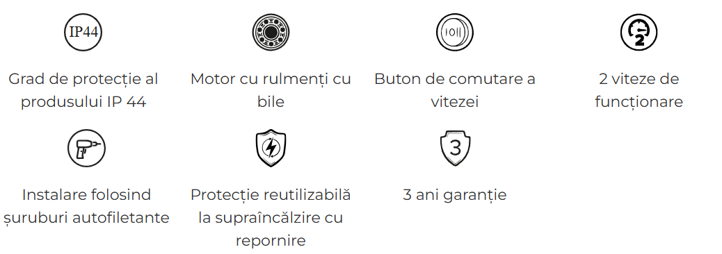 • Caracteristici constructive: 2 viteze, garantie 3 ani, motor cu rulmenti, montaj cu suruburi autofiletante, grad de protectie IP44, protectie la supraincalzire cu repornire automata, buton de comutare a vitezei