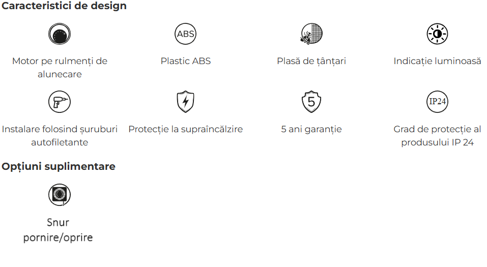 Carcasa si rotorul sunt fabricate din plastic ABS de inalta calitate, rezistent la umezeala, coroziune si raze UV, ceea ce garanteaza durabilitate pe termen lung. Toate modelele sunt echipate cu plasa anti-insecte si indicator luminos pe panoul frontal, care semnalizeaza functionarea.