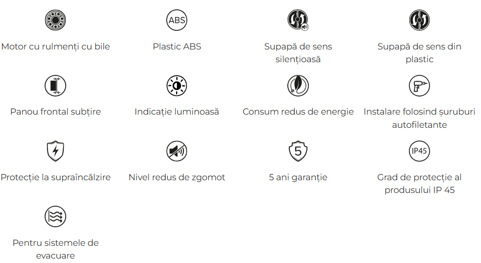Motorul cu rulmenti pe bile asigura un nivel redus de zgomot, un consum scazut de energie si o durata de viata extinsa, de pana la 40.000 de ore de functionare continua. Ventilatorul este dotat cu protectie la supraincalzire si clapeta antiretur silentioasa din plastic, care impiedica intoarcerea aerului si a mirosurilor din tubulatura.