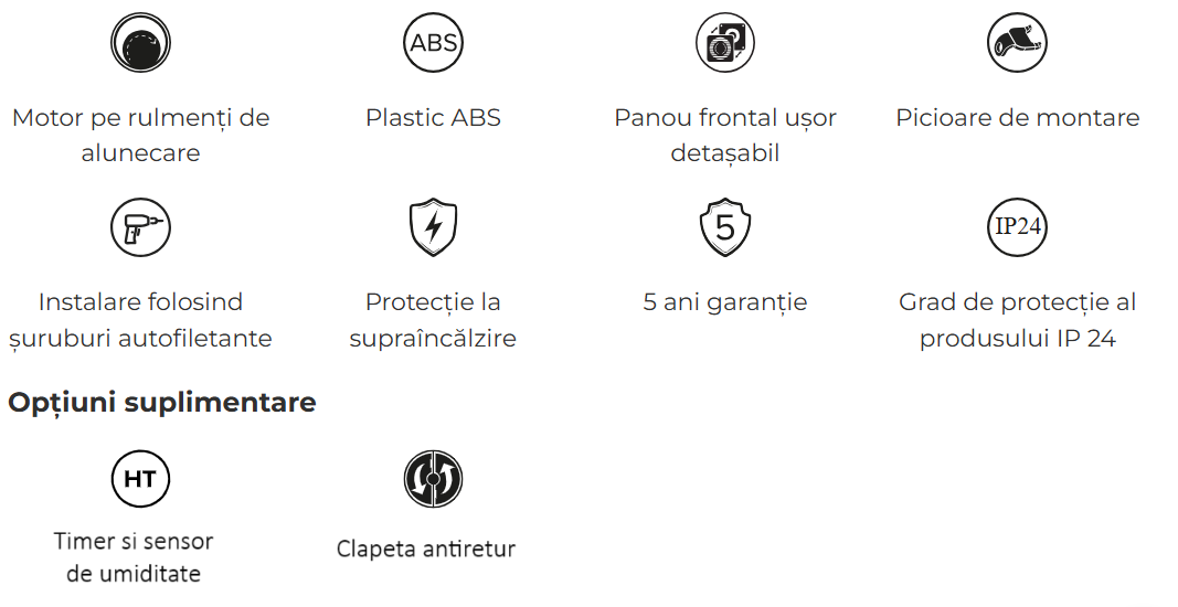 Functii ventilatie: Posibilitate pornire/oprire din intrerupator, Consum redus de energie, Silentios, Aerisire, Ventilatie, Protectie la supraincalzire, Senzor umiditate, Protectie motor, Plasa impotriva insectelor, Timer, Clapeta antiretur