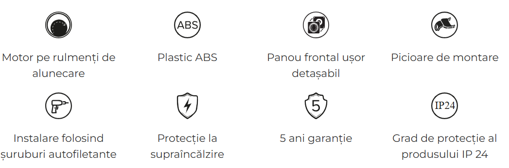 Carcasa, panoul frontal si rotorul sunt fabricate din plastic ABS de inalta calitate, rezistent la umezeala, coroziune si ingalbenire in timp. Designul patrat si compact, impreuna cu panoul frontal detasabil, faciliteaza curatarea si intretinerea periodica.