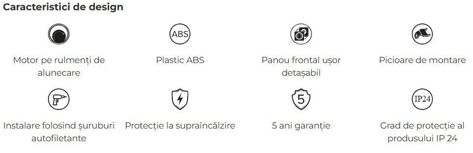 Modelul este echipat cu un panou frontal detasabil, usor de curatat si intretinut, iar picioarele de montaj si sablonul de fixare faciliteaza instalarea rapida si precisa pe perete sau pe tavan. Motorul axial pe bucsa este protejat la supraincalzire si nu necesita intretinere suplimentara, oferind siguranta si fiabilitate in utilizare.