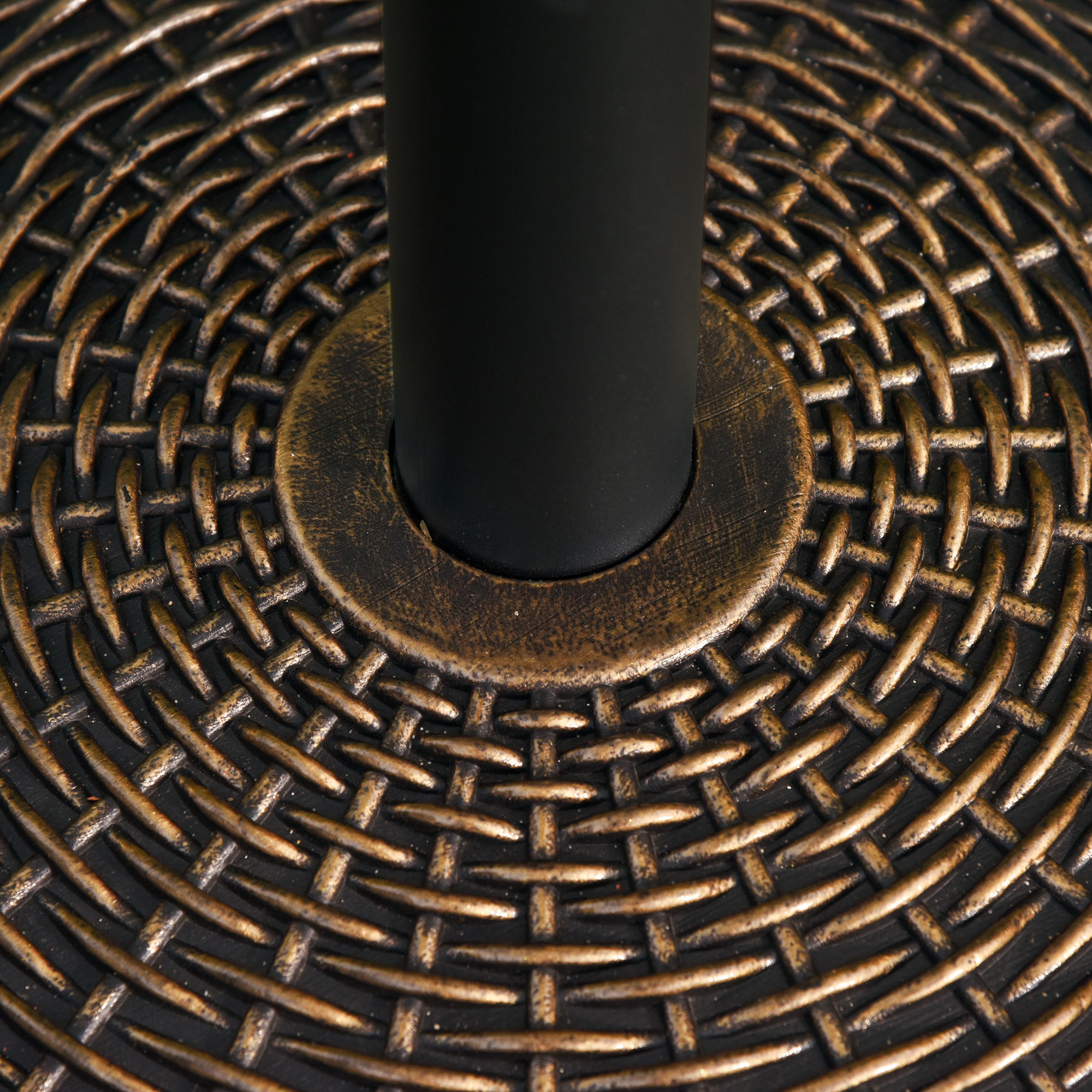 Va puteti bucura confortabil de viata in aer liber cu aceasta baza eleganta pentru umbrela de soare din bronz antic. Are un design in stil rattan, care va arata grozav in gradina sau balconul dvs. Folosind umbrela de soare cu o masa si scaune puteti crea o oaza de relaxare. Va mentine umbrela de soare in pozitie ferma si in mod constant, oferindu-va toata umbra de care aveti nevoie. Bucurati-va de momentele zilei la umbra cu aceasta baza practica oentru umbrela de soare.