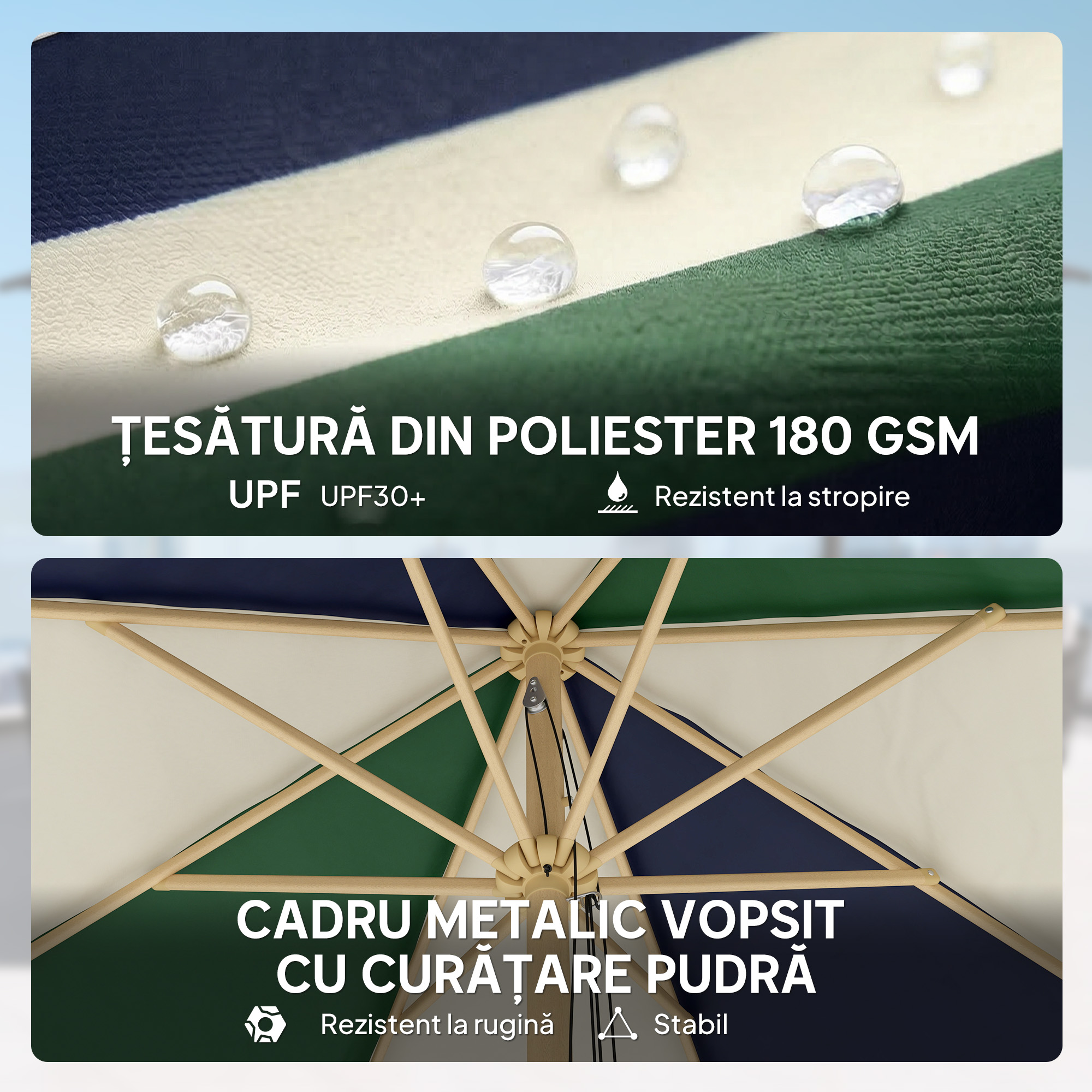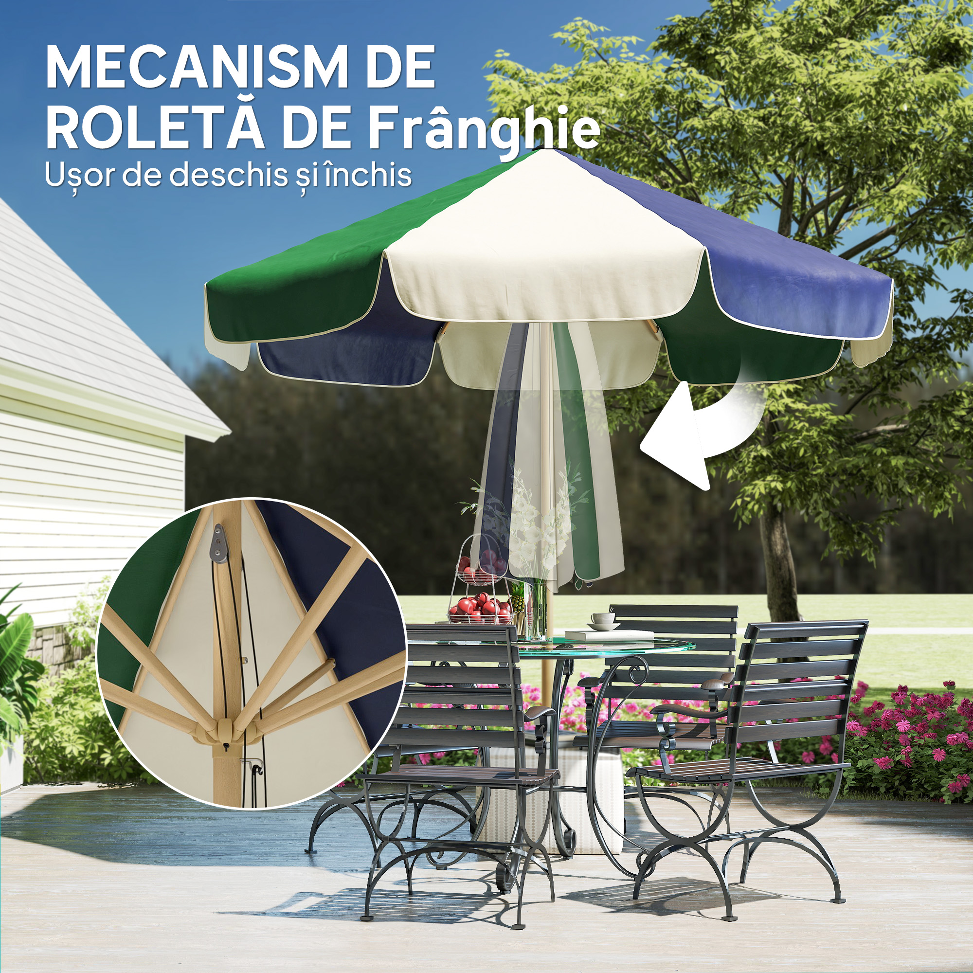 Adauga o nota naturala spatiului tau exterior cu umbrela de gradina [BRAND NAME]. Cadrul cu efect de lemn, acoperisul crem si verde inchis cu volan creeaza o atmosfera relaxata. Protectia solara UPF30+ si sistemul de ridicare cu sfoara o fac ideala ca umbrela de exterior pentru gradina sau balcon, oferind prospetime si umbra pentru dupa-amiezi linistite in aer liber.