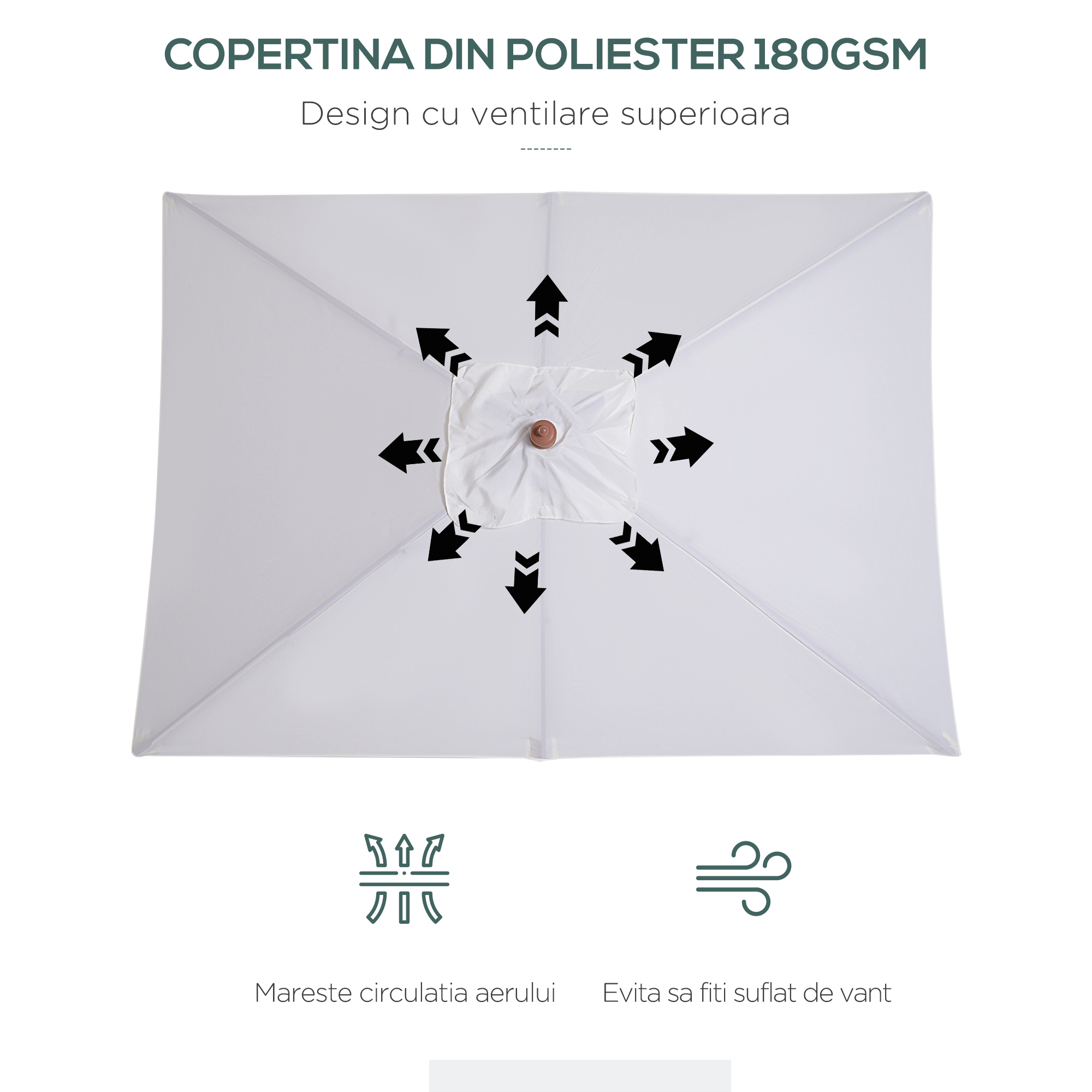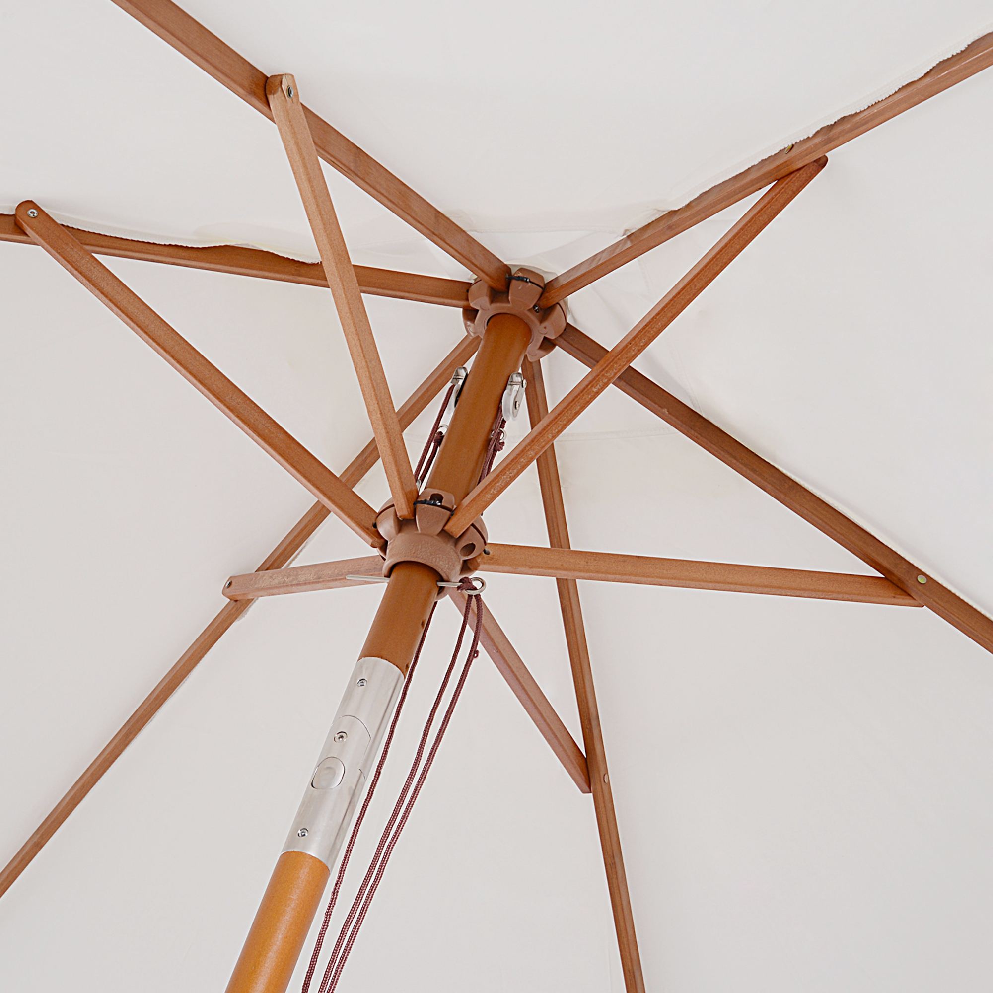 Protejati-va de soare in timpul zilelor petrecute in aer liber cu aceasta umbrela practica de gradina [BRAND NAME]. Catargul din lemn de pin si cele 6 lamele care sustin acoperisul garanteaza stabilitatea structurii. Husa este fabricata din poliester 180g/㎡ pentru a va proteja eficient de soare. Mecanismul cu coarda faciliteaza deschiderea si inchiderea umbrelei de exterior.