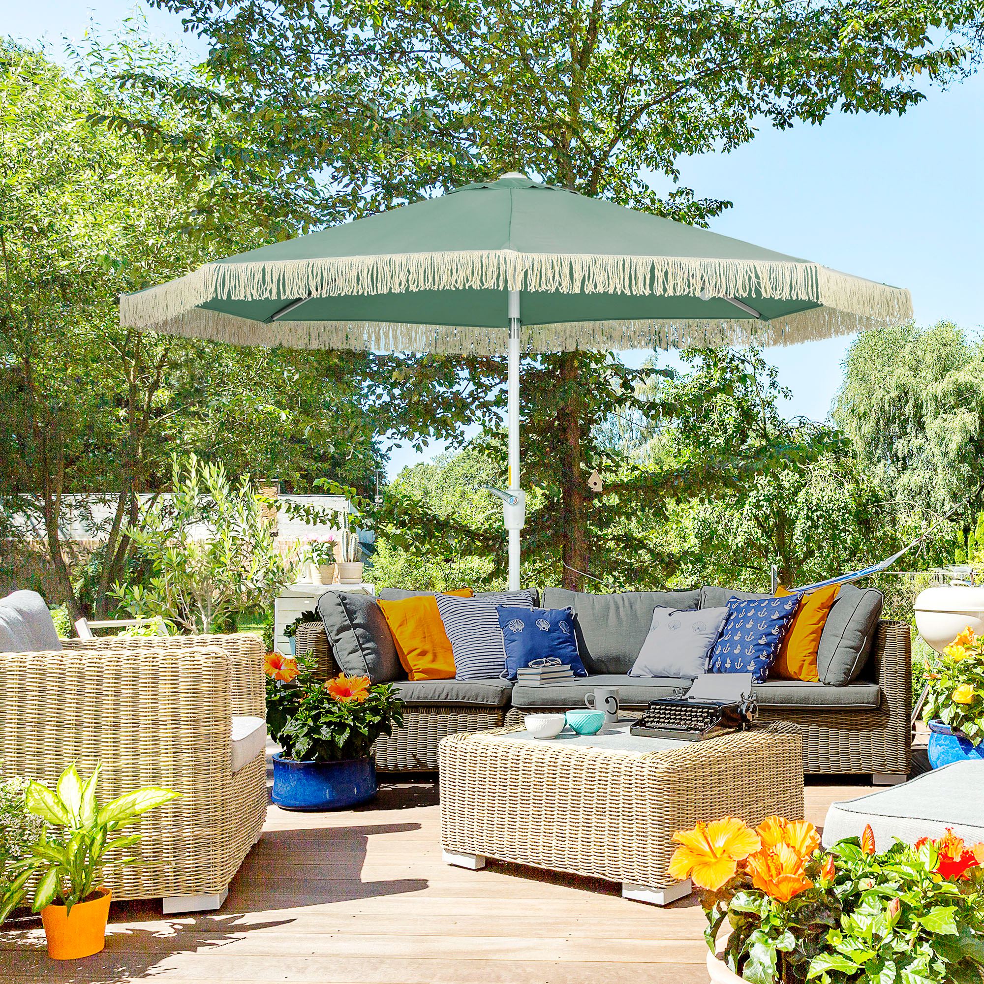 Aceasta umbrela eleganta de gradina, inclinabila si cu diametrul de 265 cm, asigura protectie optima impotriva razelor solare. Franjurile sale adauga un element decorativ spatiului tau exterior. Structura solida din otel garanteaza stabilitate, iar datorita manivelei integrate, umbrela se deschide si se inchide cu usurinta. Bucura-te de spatiul tau exterior cu aceasta umbrela rotunda!