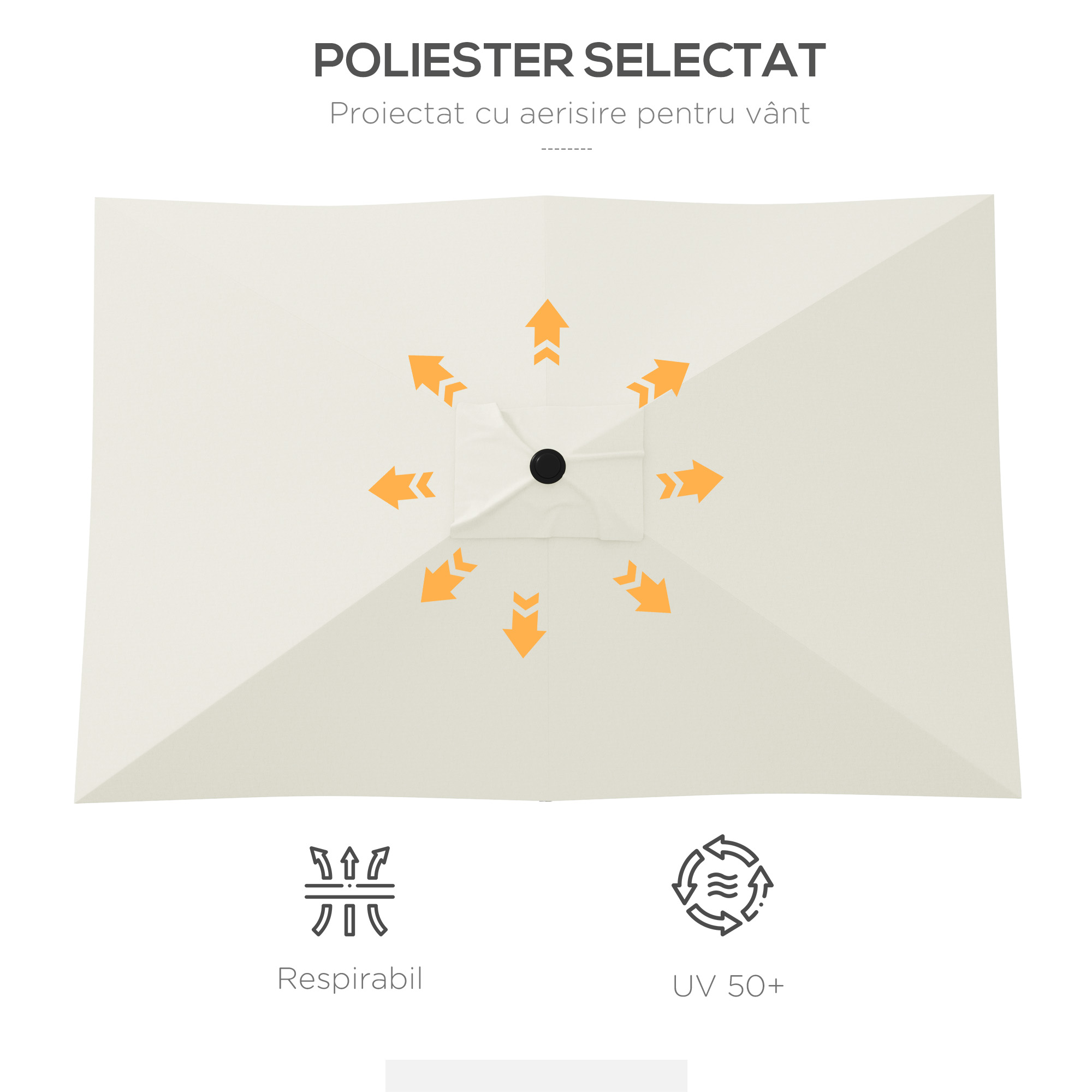 Umbrela de gradina [BRAND NAME] este o alegere ideala pentru a va bucura de zilele insorite ramanand tot timpul la umbra, datorita inclinatiei reglabile. Structura umbrelei dreptunghiulare este realizata din metal, pentru rezistenta optima. Perfecta pentru terasa si curte, se potriveste perfect cu mobilierul de gradina, iar copertina din poliester respinge ploaia, permitandu-va sa va bucurati de pranzul in aer liber.