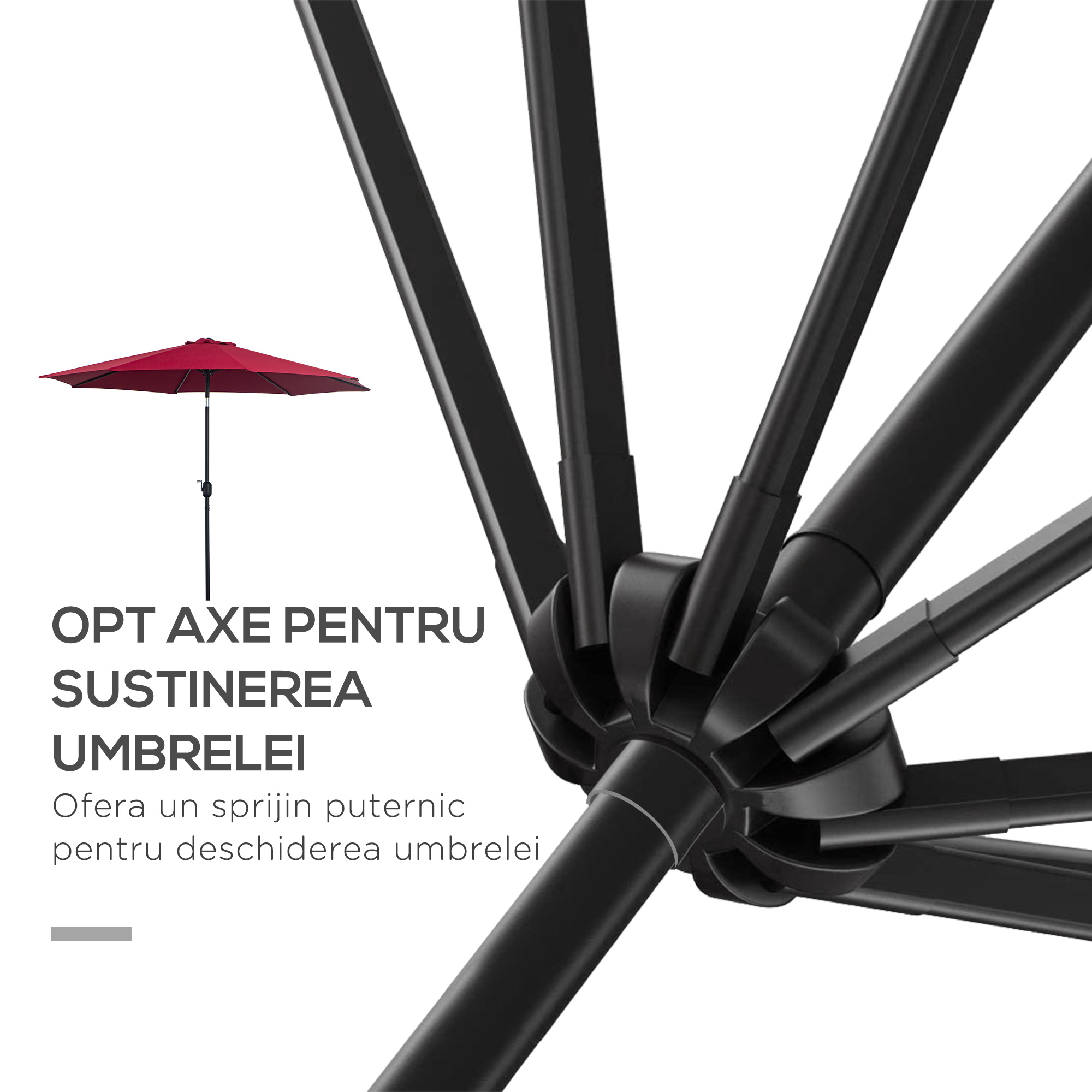 Aceasta umbrela [BRAND NAME] este perfecta pentru a crea umbra de soare in cele mai fierbinti ore. 8 tije de sprijin din otel pentru rezistenta maxima. tesatura din poliester impermeabila cu protectie UV. Basculabil cu manivela. Baza nu este inclusa.