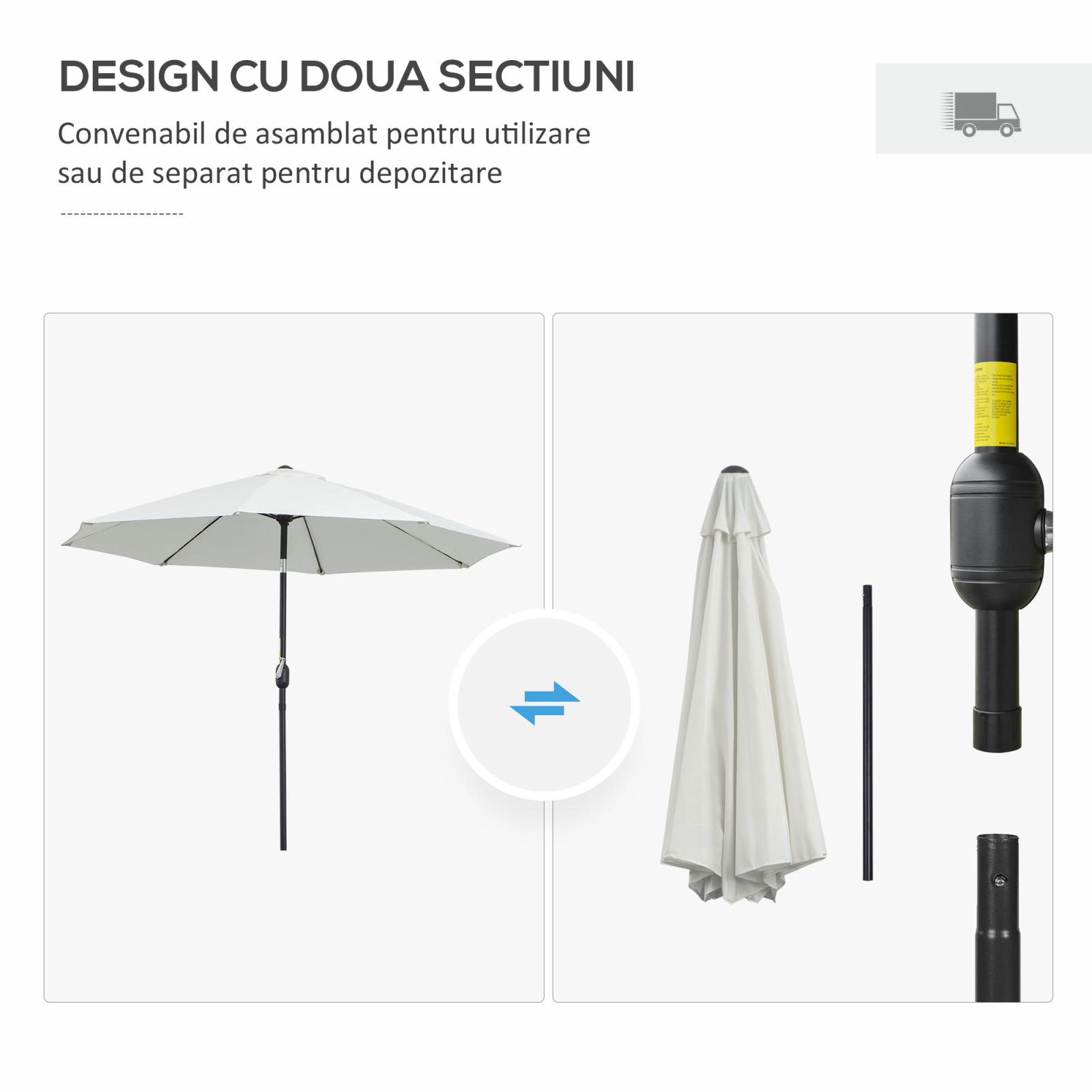 Aceasta umbrela de gradina [BRAND NAME] ofera un sistem inovator de inclinare in 3 pozitii, adaptabila in functie de soare. Cu o manivela practica si un diametru de 265 cm, umbrela este ideala pentru spatii exterioare variate. Culoarea alb-crem confera un aer elegant si rafinat, ideala pentru decorul gradinii, balconului sau terasei.