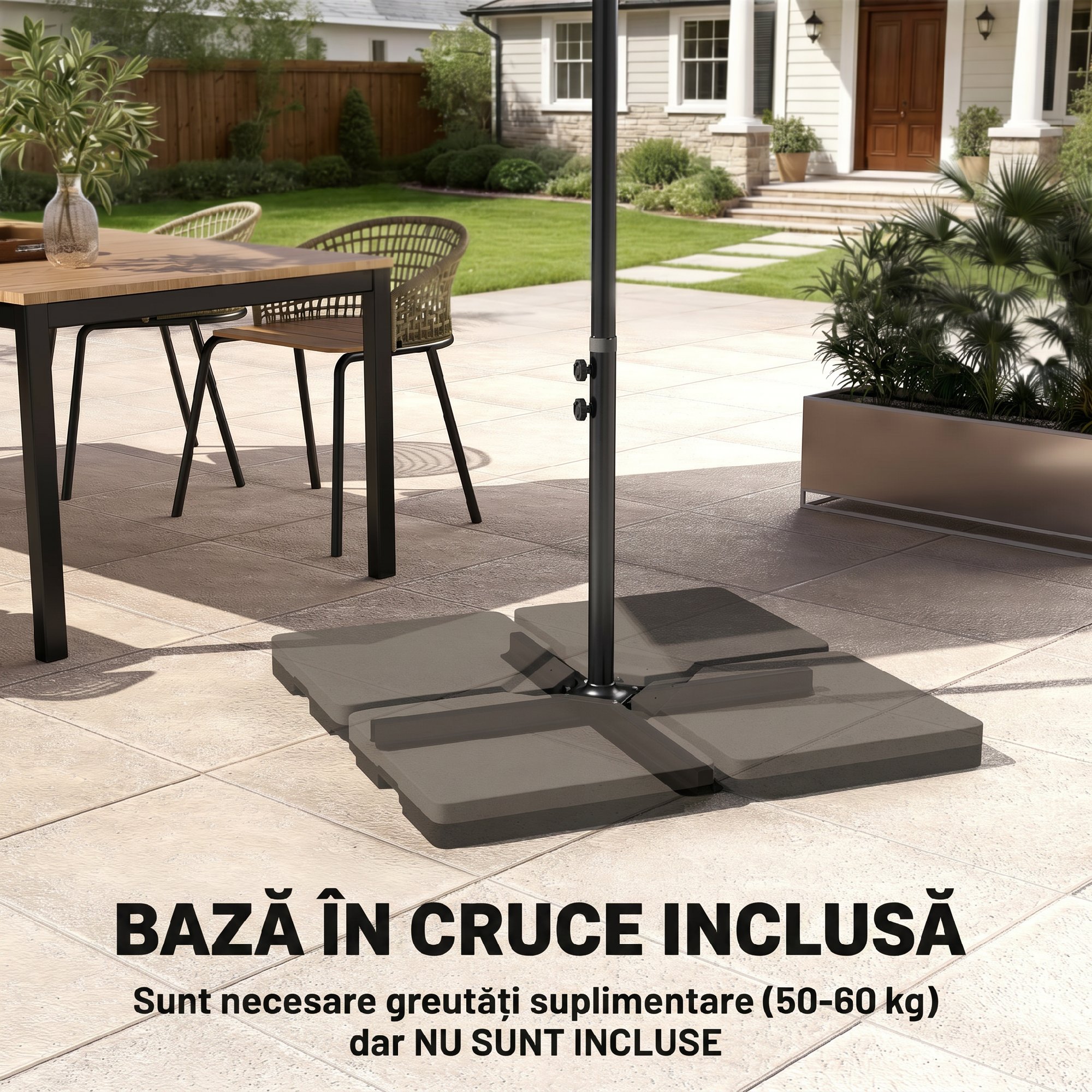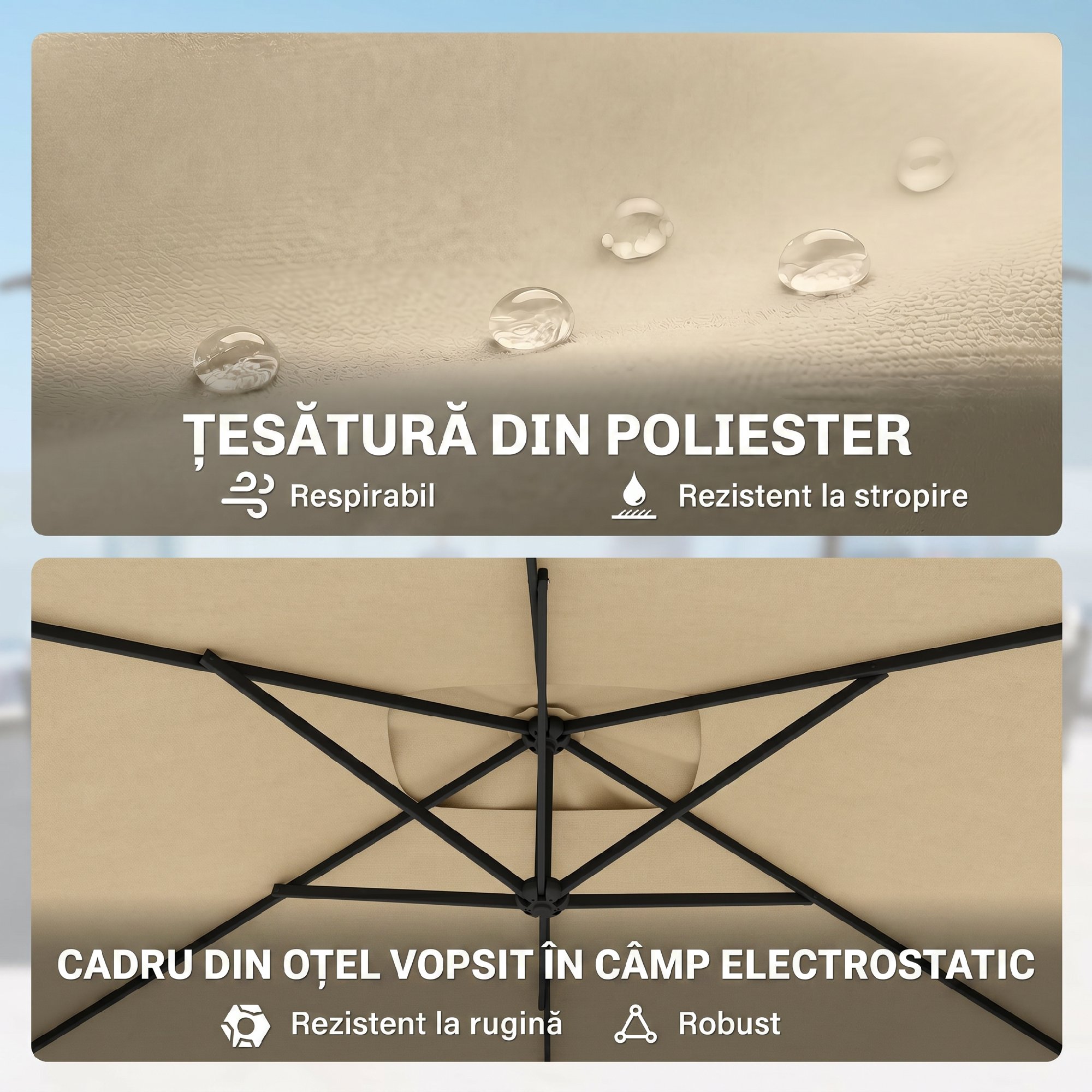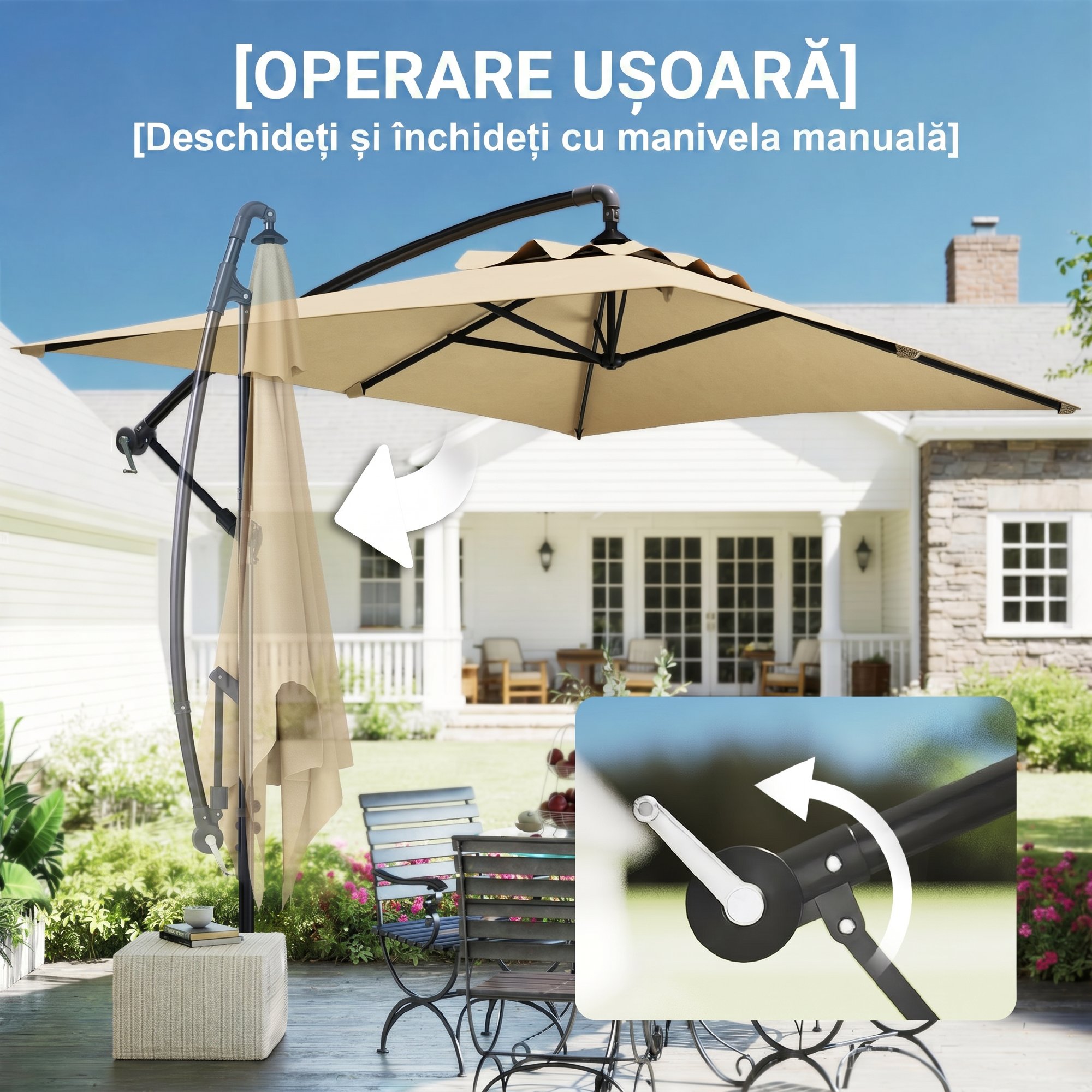 Bucura-te de aer liber in zilele insorite cu umbrela noastra de gradina Ousunny. Designul acestei umbrele suspendate asigura mai mult spaţiu la umbra pentru a o putea combina cu mese sau seturi de mobilier de gradina. Datorita sistemului cu manivela de pe tija, umbrela se deschide şi se inchide foarte uşor, iar structura din otel si poliester asigura o rezistenta optima pentru utilizarea in spatii exterioare.