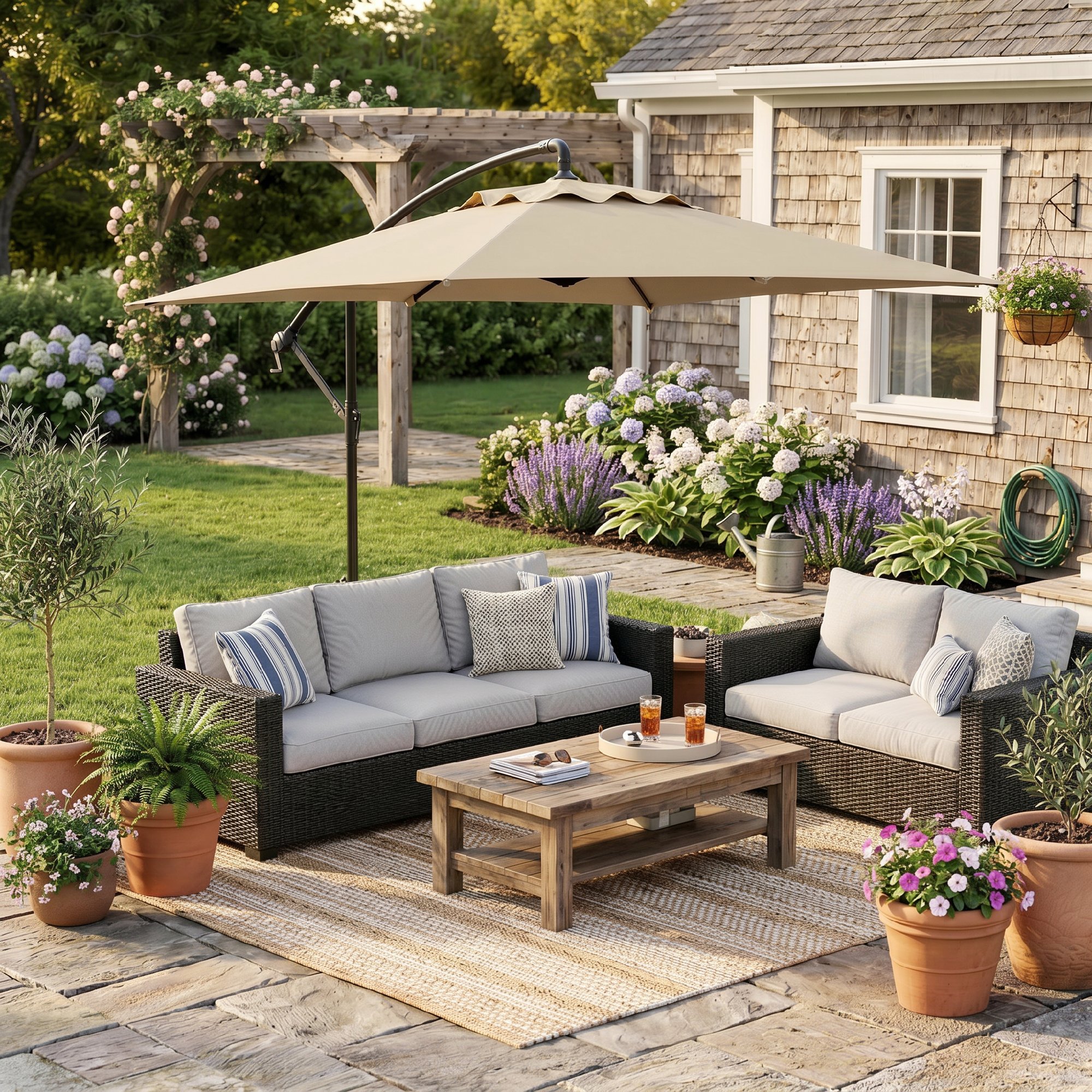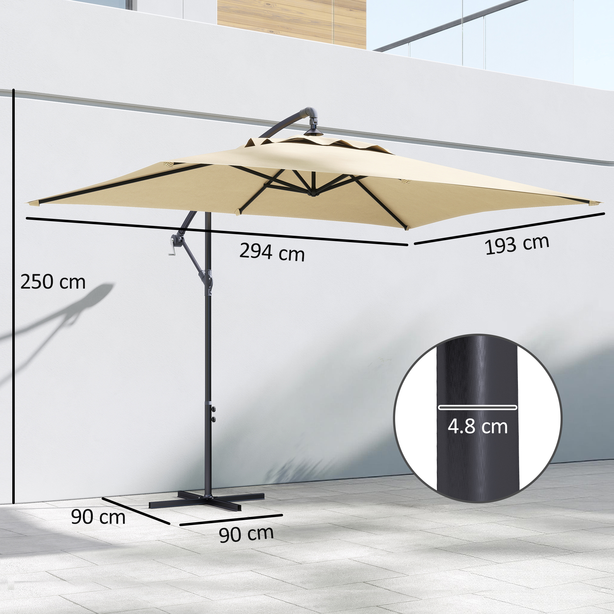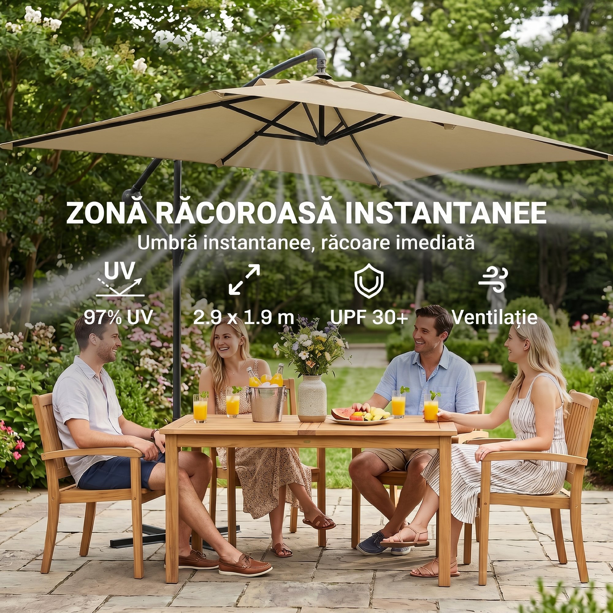 Bucura-te de aer liber in zilele insorite cu umbrela noastra de gradina Ousunny. Designul acestei umbrele suspendate asigura mai mult spaţiu la umbra pentru a o putea combina cu mese sau seturi de mobilier de gradina. Datorita sistemului cu manivela de pe tija, umbrela se deschide şi se inchide foarte uşor, iar structura din otel si poliester asigura o rezistenta optima pentru utilizarea in spatii exterioare.