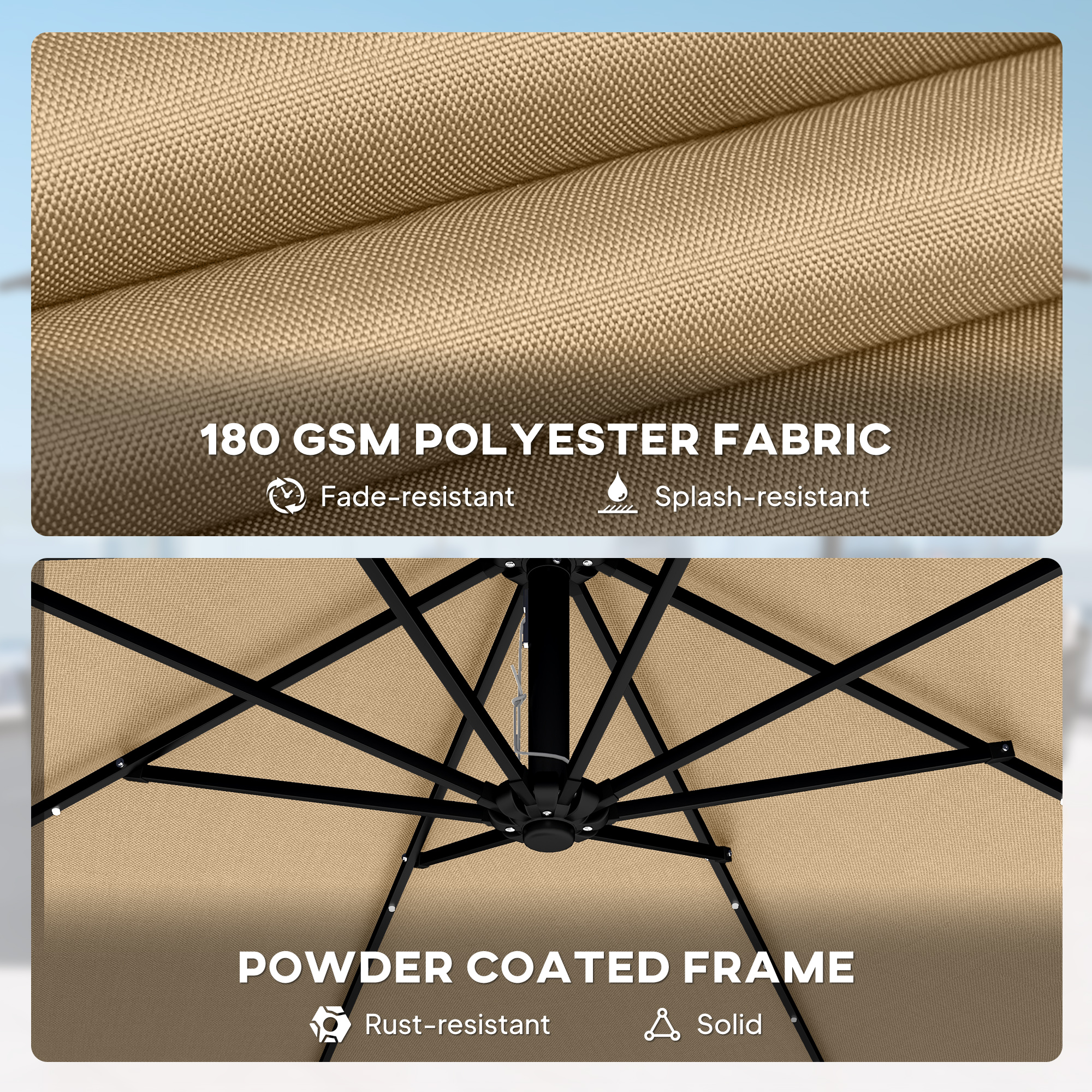 • STRUCTURa ROBUSTa: Stalpul umbrelei de exterior din aluminiu Ø48 mm, 8 nervuri intarite, material PA de 180 gsm cu protectie UPF50+ si rezistenta la apa pentru stabilitate si confort in aer liber.