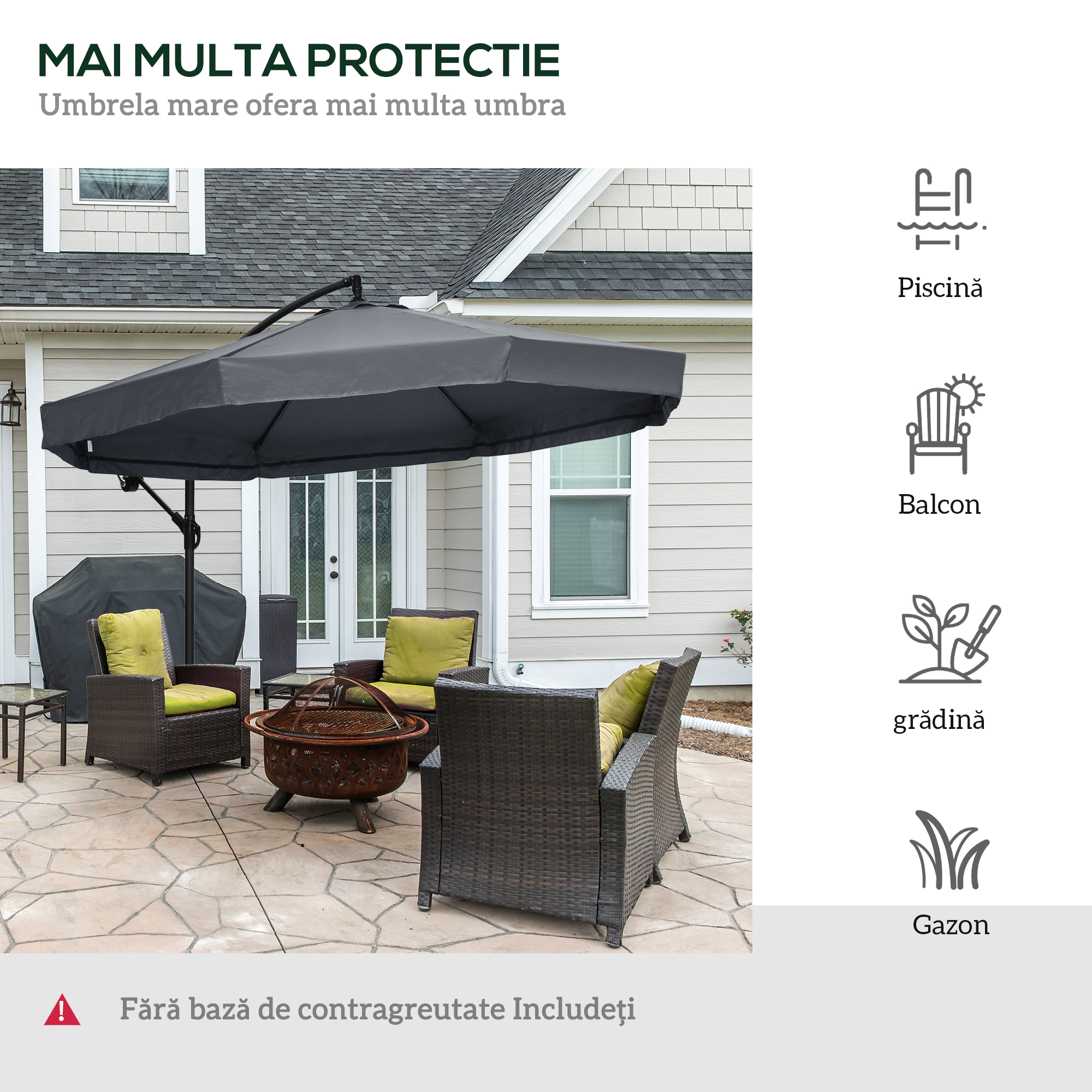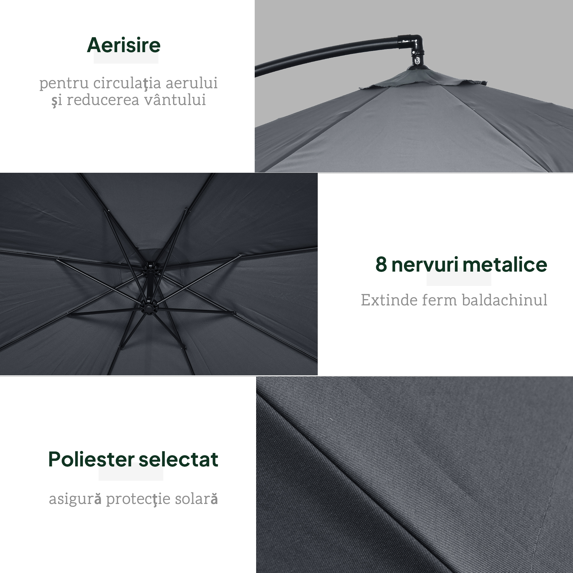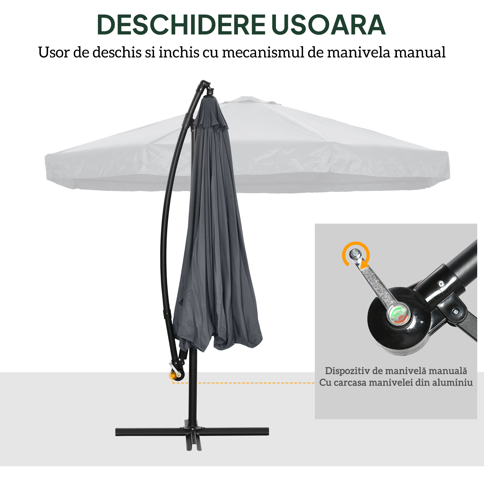 Esti in cautarea unei umbrele practice de exterior pentru spatiul tau? Umbrela cu brat [BRAND NAME] ofera o rotatie completa de 360°, o plasa care permite ventilatia si o deschidere usoara cu manivela. Orificiile de ventilatie din partea de sus asigura circulatia aerului pentru o mai buna rezistenta la vant, iar baza in forma de cruce confera stabilitate structurii. Designul clasic si liniile simple fac ca aceasta umbrela de terasa sa fie ideala pentru a crea umbra necesara de care ai nevoie pentru a te bucura de aer liber.