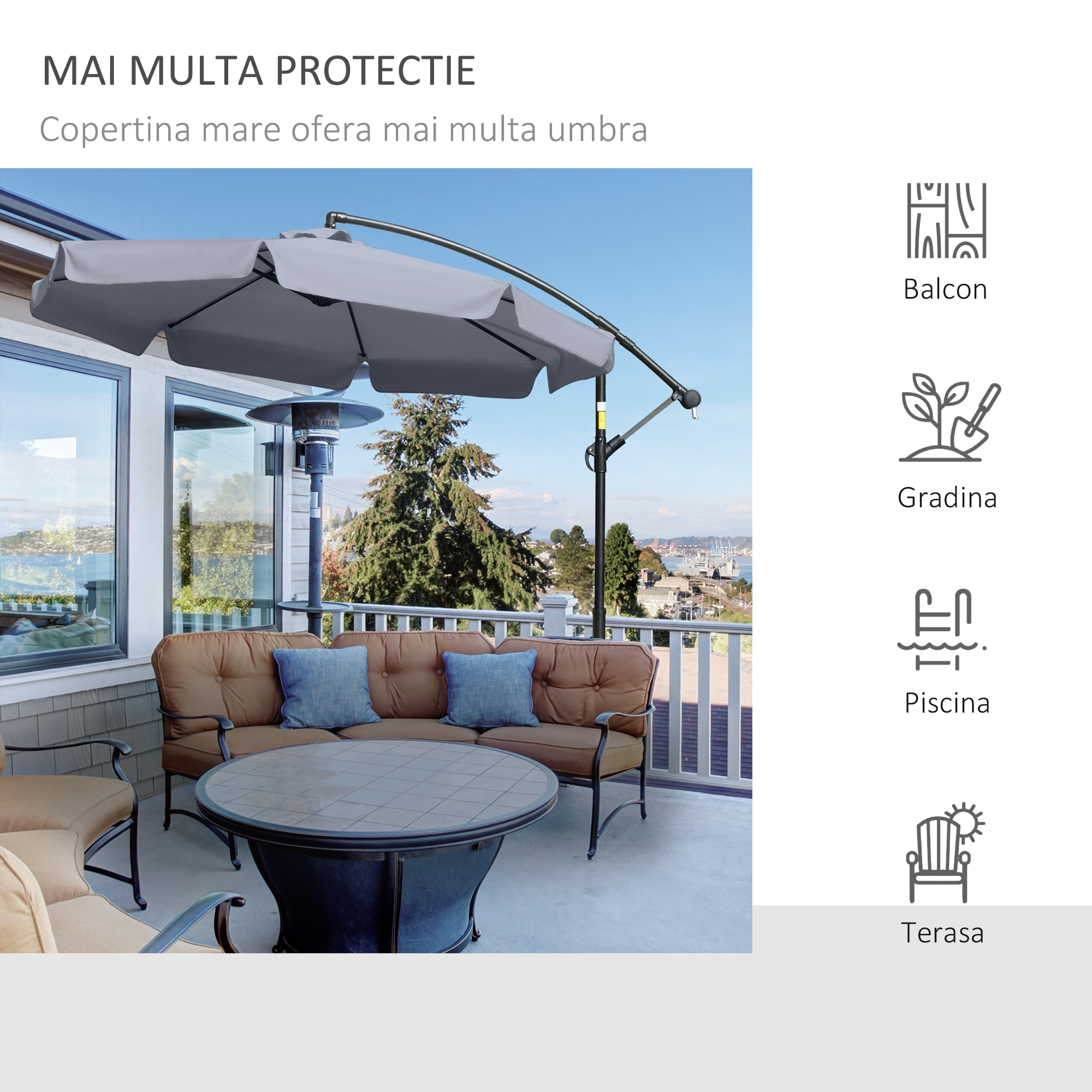 Aceasta umbrela de gradina eleganta [BRAND NAME] este un accesoriu obligatoriu pentru vara. Designul cu brat va permite sa stati la umbra fara neplacerea unui stalp central, adapostind de soare mese mari, canapele, seturi de bistro si multe altele. Structura metalica centrala este rezistenta si robusta, conectata la acoperis cu 8 nervuri pentru sprijin. Umbrela ofera multa umbra, racorind zilele toride de vara, dar creand si o atmosfera placuta.