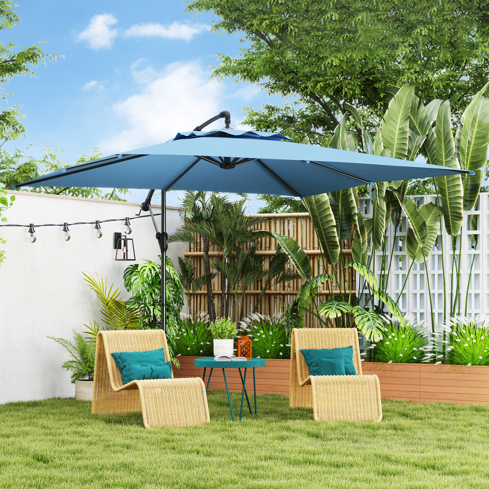 Bucurati-va de zilele insorite la adapostul umbrelei suspendate [BRAND NAME], conceputa pentru spatiile exterioare. Copertina din poliester de 180 gsm blocheaza razele UV 50+ si previne decolorarea rapida. Spitele metalice antirugina ofera rezistenta structurii, iar rotatia completa de 360° va permite sa gasiti umbra perfecta pe parcursul zilei. Manivela faciliteaza deschiderea si inchiderea.