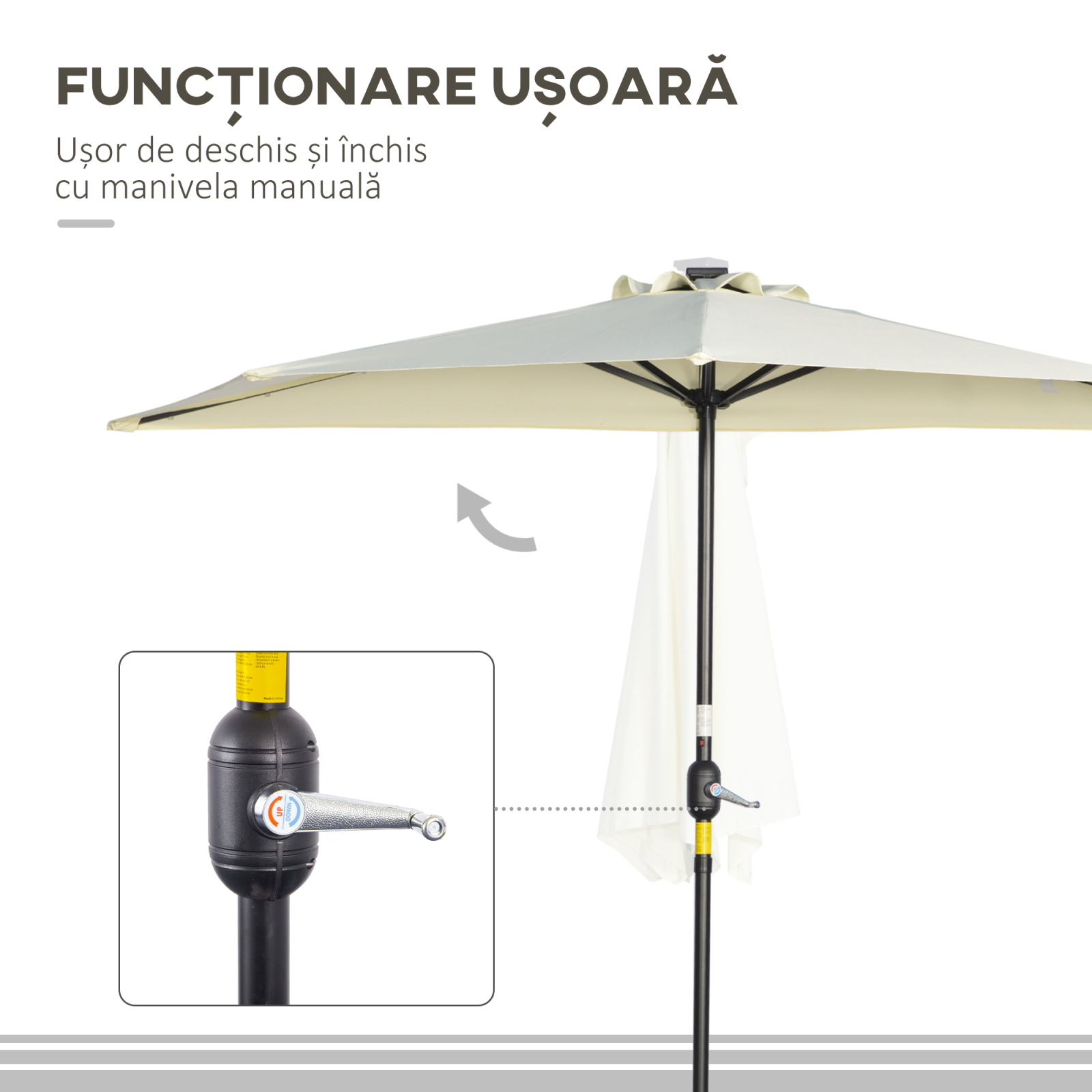 • • Umbrela de terasa este usor de deschis si inchis datorita mecanismului cu manivela