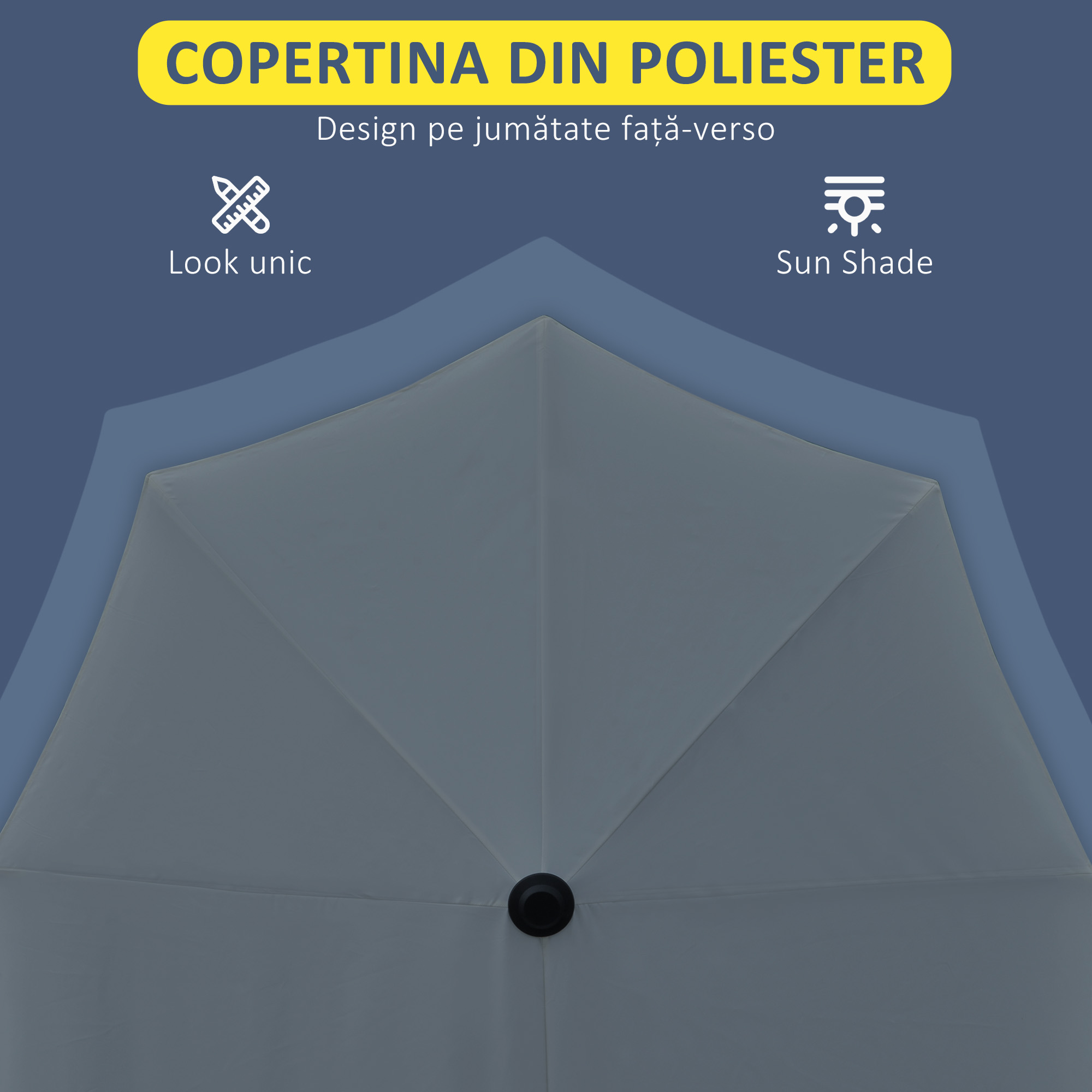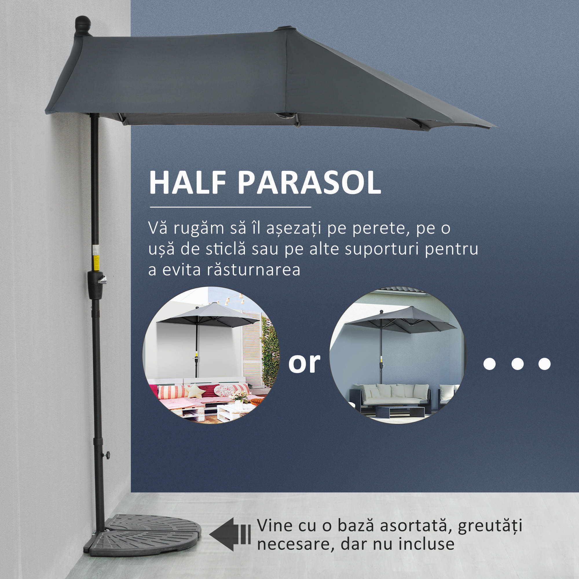Aceasta umbrela de gradina semicirculara [BRAND NAME] este alegerea perfecta pentru cei care au un spatiu limitat, dar nu doresc sa renunte la momentele de relaxare la umbra.Conceputa pentru a fi sprijinita de un perete, umbrela de gradina semicirculara este perfecta pentru balcoane inguste si spatii exterioare mici. Este usor de utilizat datorita manivelei care iti permite sa o deschizi si sa o inchizi rapid si ofera protectie maxima datorita copertinei ranforsate.