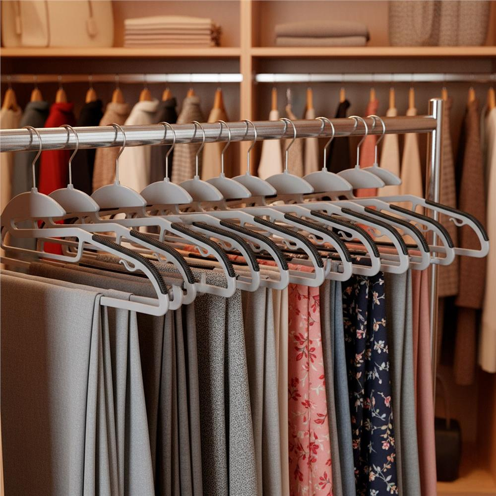 Set de 20 umerase pentru haine, realizate din material PE rezistent, ideale pentru organizarea eficienta a garderobei. Forma ergonomica ajuta la mentinerea hainelor fara deformare, iar suprafetele antiderapante de pe umeri si bara inferioara previn alunecarea. Carligele metalice rotative la 360° permit utilizarea flexibila, iar carligele interioare sunt utile pentru bretele sau accesorii.